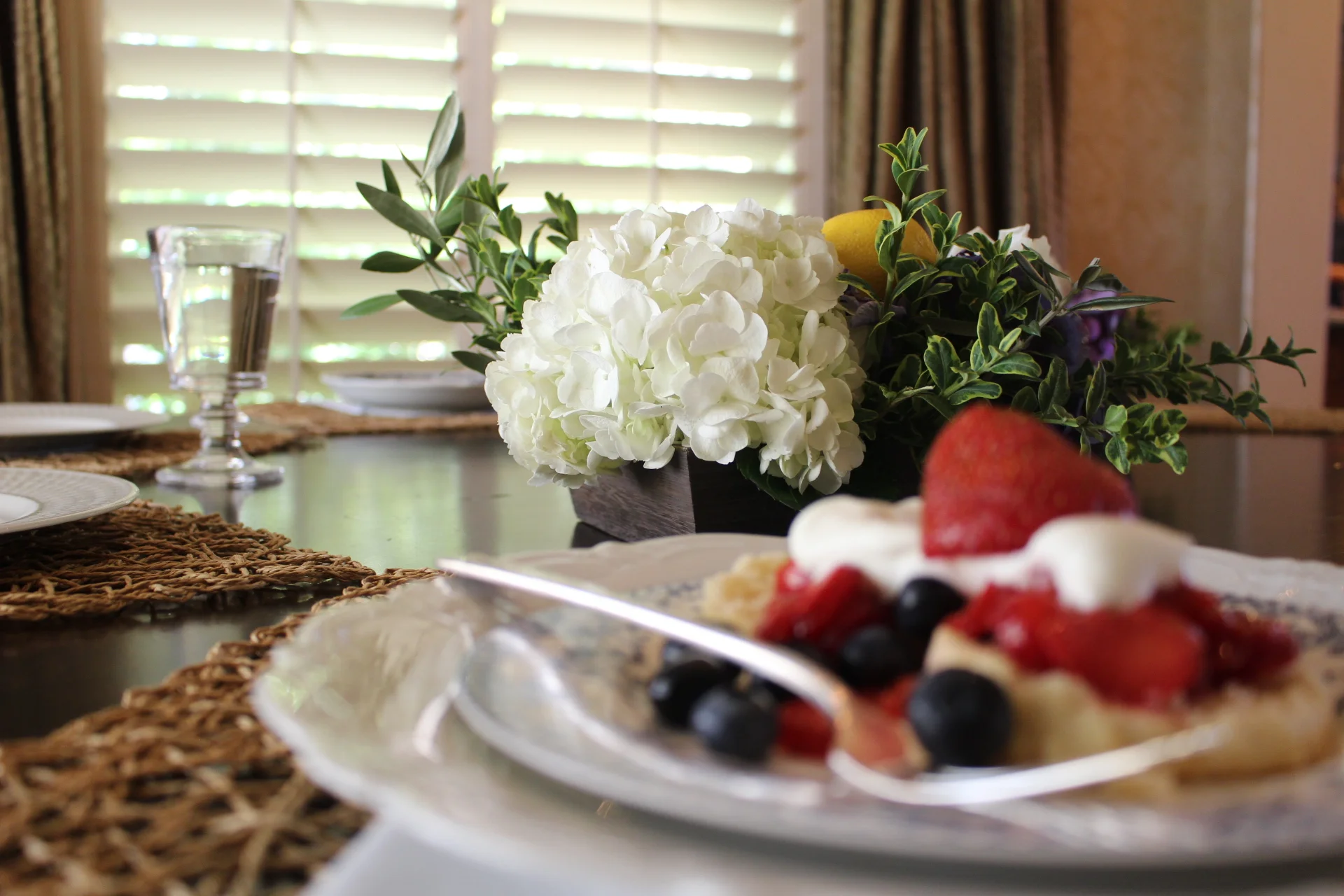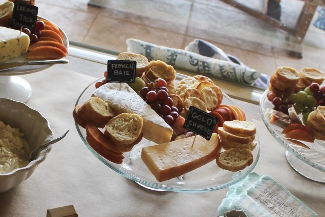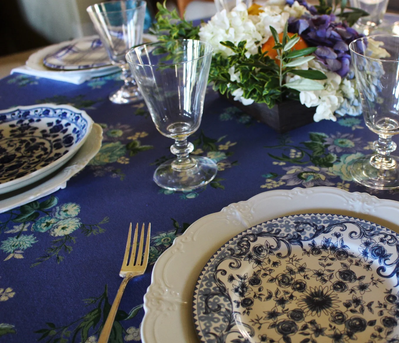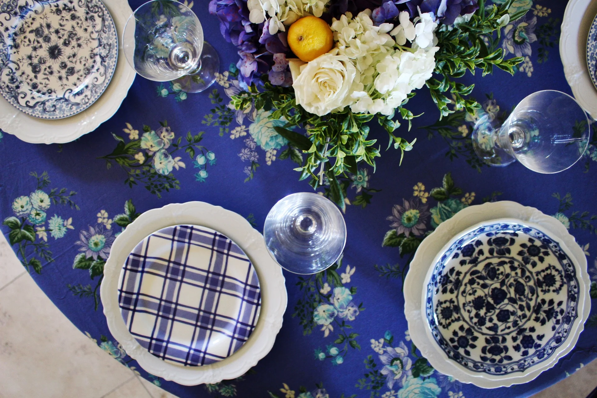 We certainly went with something blue on the tables. Blue and white plates. Blue and white floral tablecloths too. To avoid pattern overwhelm, we anchored with white china and white cotton napkins. Cloth napkins are really worth the investment. They are cheap to buy in bulk and make the whole party feel more luxurious. Not fun to iron, but saves a ton of cash. I pretty much hate the word luxurious, but it's truth here. Silver at each table setting tied it together. Can you set silver and still serve food buffet style? We did. If we were doing place cards, I think it would be rad to put those in the prongs of the fork. This was just not that kind of crowd though. I lost this battle.