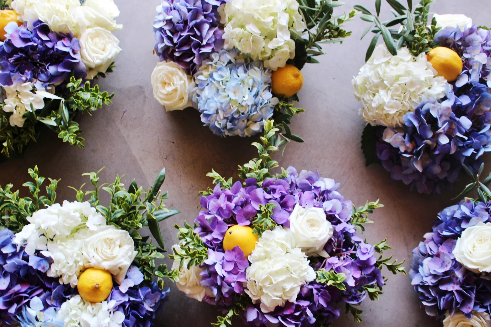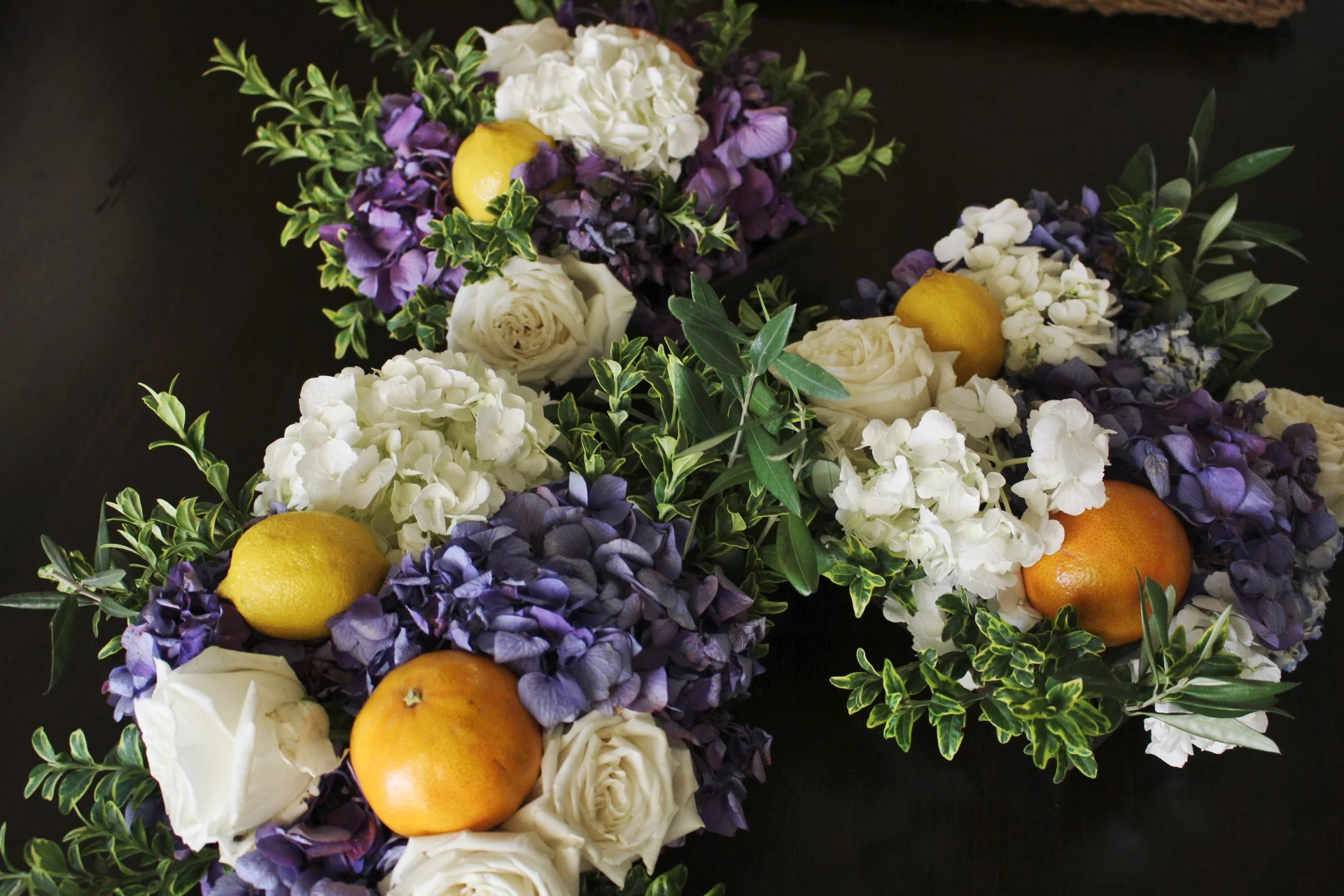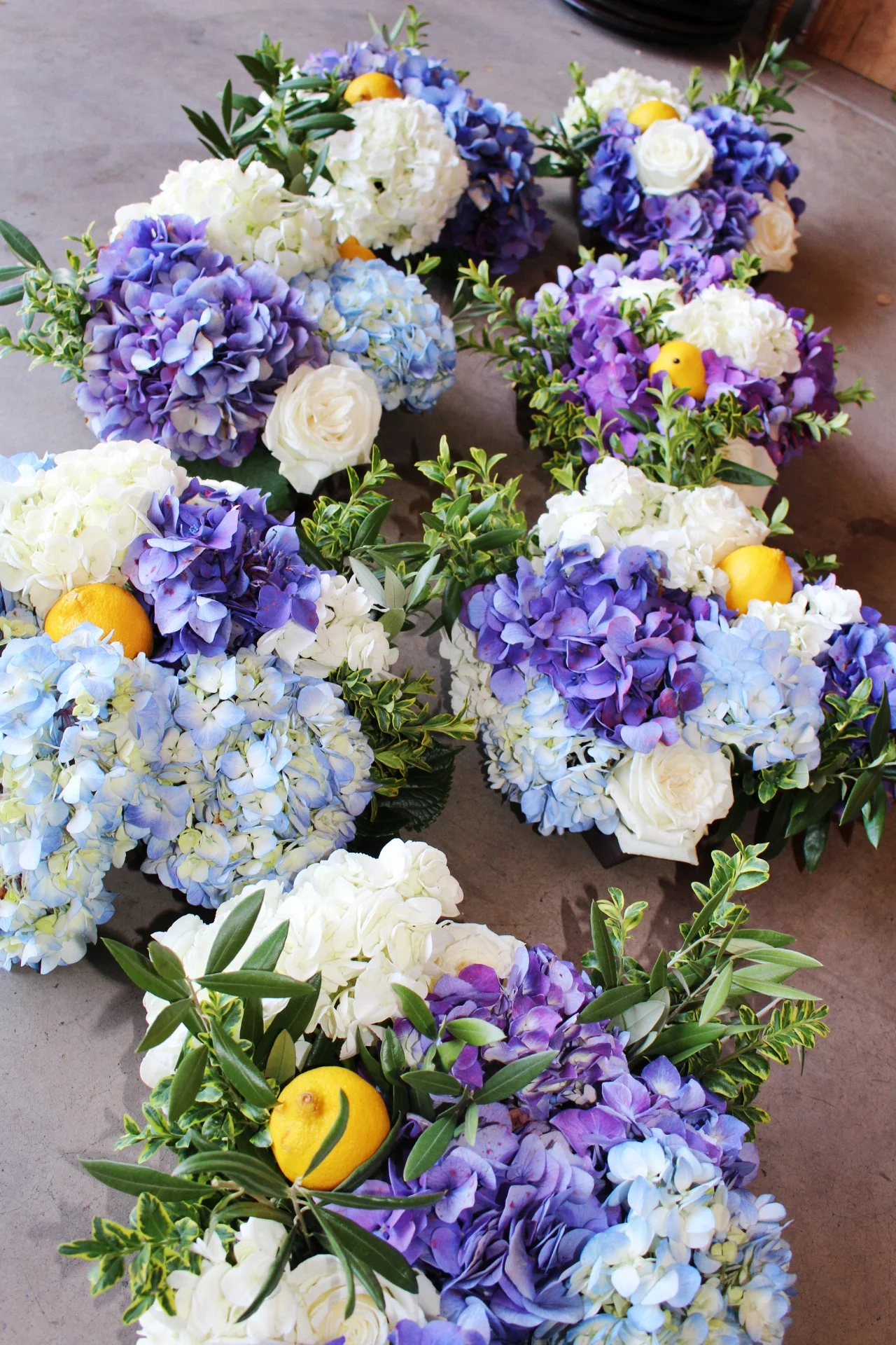 Flowers. We went to the flower mart. A friend took us downtown early one morning and we went to flower heaven. We picked out blue, purple and white hydrangeas, white roses and lots of greenery. Lemons and oranges ended up in the arrangements too. This was Mom's idea, though I wish I could take credit for it. Honestly, I thought it was weird at first. She was the visionary here. We learned the hard way, hydrangeas don't keep well overnight. Next time we will put these together the morning of the event. Always learning! The wooden boxes for the centerpieces came from our last trip to the Peddler's Fair, where my mom bought sixteen of them for $1 each. "A bargain!" They worked perfectly. We soaked flower foam in water and put it in the bottom of the boxes. Then, we arranged the flowers, making sure the stems were secure in the foam. We were pretty proud of ourselves. What? We were.