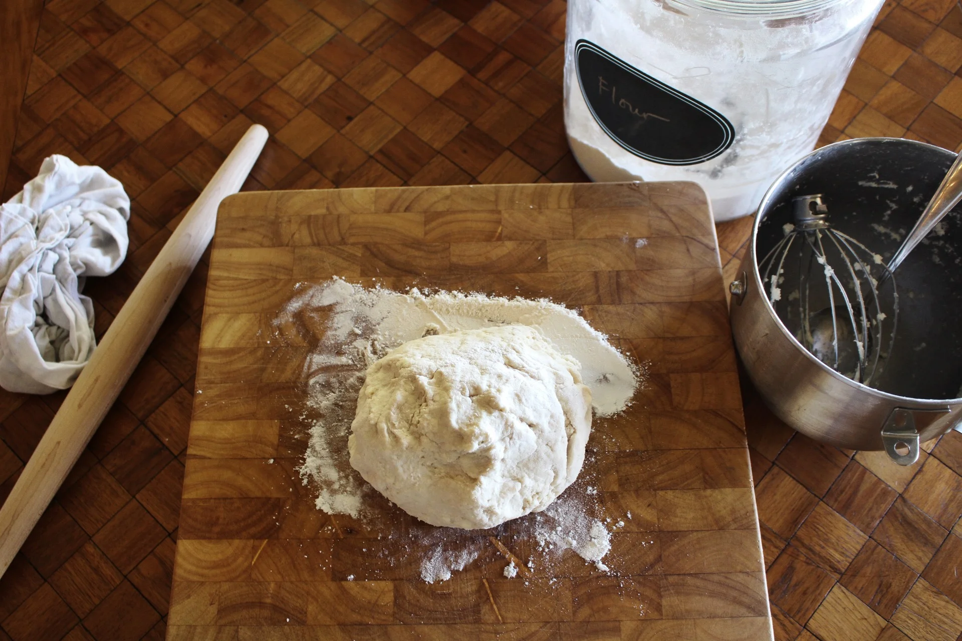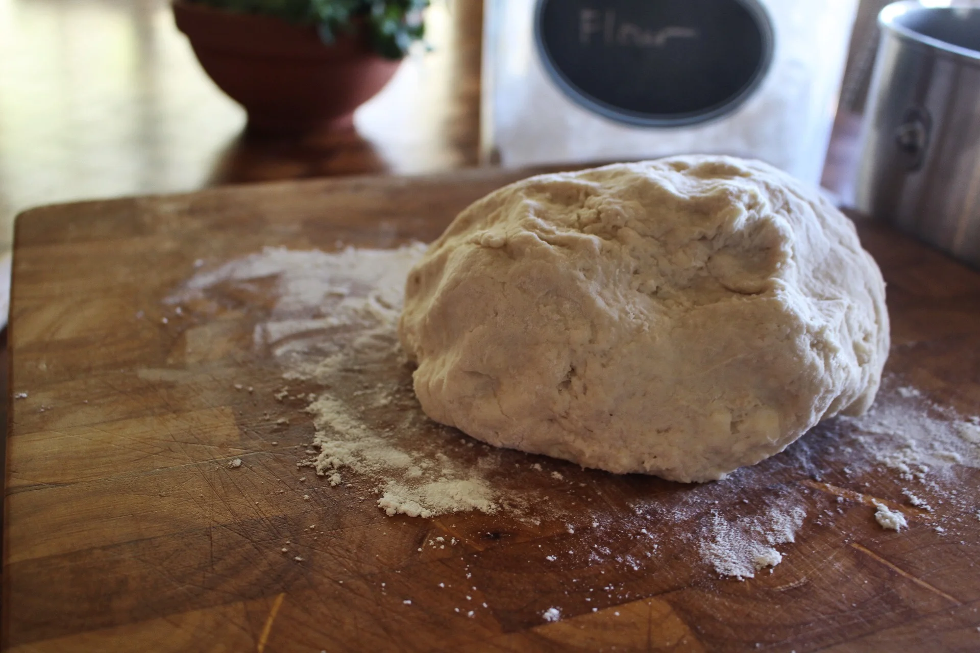 Slowly mix in the buttermilk. Mix until dough forms, but do not mix until smooth. Dough should be falling apart a bit.