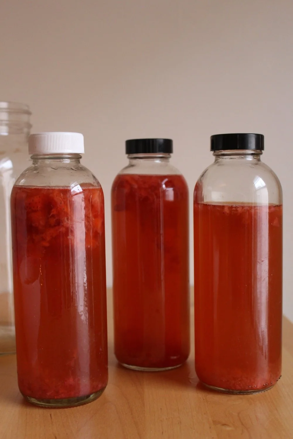 Once you get your desired carbonation, strain out the strawberries and rebottle. This is optional.